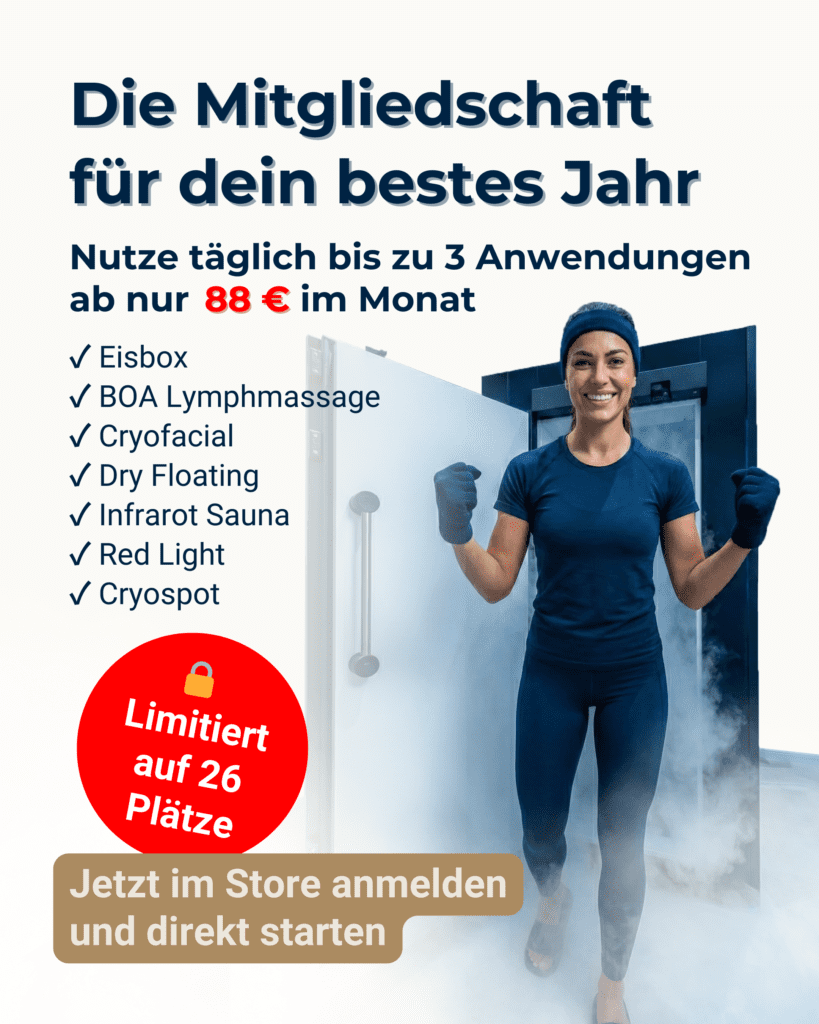 Equipped with a modern cold chamber, which is used by professional and ambitious amateur athletes for regeneration, as well as other cold therapy applications, Cryopoint Rosenheim offers everyone the opportunity to achieve their individual goals in fitness, regeneration, body shaping, and well-being.